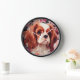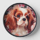 Retrato de primer plano de un cachorro blenheim de Cavalier, el rey Charles Spaniel, de estilo pintoresco. El perro tiene un abrigo blanco y marrón, con grandes ojos marrones expresivos. Está rodeado por una profusión de rosas rosas y melocotones, creando un ambiente suave y romántico. La piel del perro se representa con un detalle meticuloso, capturando la textura y el flujo de su pelo largo y sedoso. Un regalo perfecto para los amantes de las cavidades.