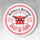 Personalice este reloj de pared con la temática de la cocina redonda con su nombre y otro texto. Sólo edita en el sencillo editor de Zazzle. Creada con una simple olla de cocción de un punto de polka rojo y blanco con acentos blancos y negros sobre blanco, con un elegante logotipo retro. La elección de numerosos estilos redondos.