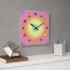 El reloj sin números tiene un fondo de color arcoiris, coloreado desde el centro - verde, amarillo, naranja, rojo, rosa, morado. Estos mismos colores marcan los botones "numeral", alternando con botones negros que son más pequeños.