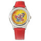 En este diseño de reloj, un retrato de un payaso de colores brillantes, riéndose con un gorra en la parte audaz de su cabeza y el pelo rosado a ambos lados de su cabeza. El fondo es amarillo intenso y naranja, con estrellas brillantes.