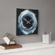 abstract riing, watercolor style, free hand pattern, wall clock, blue greyish tones, black background,