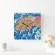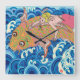 un chica conduce a una gran carpa que nada en las grandes olas.