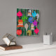 Este reloj de pared tiene un diseño que se parece a los adornos en rojo, verde, azul, rosa, oro, plata y blanco en un árbol de Navidad.