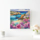 "Arcos En El Mar". Una vista idílica de una hermosa bahía, con un solo barco. Una pequeña playa de arena está rodeada por un hermoso mar azul y flores rosas y violetas.
