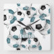 Este reloj de pared con temática de fútbol muestra la imagen de un grupo de balones de fútbol verde azulados, negros y blancos de tamaño variado - personalizar con el nombre del atleta - de katz_d_zynes