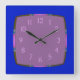 Un diseño azul bonito del reloj con una frontera del arco iris y un centro de color de malva. Este reloj tiene números rosados para felicitar el diseño. Elija de negro o de manos de plata. Disponible en forma del cuadrado solamente.