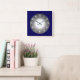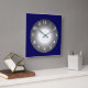 Un diseño de reloj dramático en azul oscuro con un centro redondo iluminado de gris plateado. Los números blancos y las manos de reloj plateado completan este diseño. Fácil cambio de cuadrado a redondo o añadir un marco.