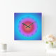 Un diseño de círculo azul/acuático atmosférico con efecto de brillo. El centro del diseño del reloj tiene rosa y melocotón. Este reloj trendy tiene números azules oscuros. La personalización cambia la forma a redonda. Las manecillas también están disponibles en plata. Tenga en cuenta: Este no es un producto led, solo diseño impreso.