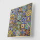 Reloj acrílico de pared de 10.75" x 10.75" con una imagen de coloridas baldosas mexicanas con una variedad de patrones y una brillante cara de reloj dorado. Sugerencia: Para acentuar la belleza de este reloj, pinta las manos de oro. Vea toda la colección Mexico Clock en la sección HOME.