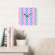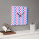 A checkerboard pattern of pink, blue, and white squares creates a vibrant and lively visual effect, conveying playfulness and energy.