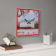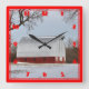 Una toma de un Barn Rojo de Kansas que es brillante y colorido con árboles, cielo azul y nieve. Es un norte brillante y colorido de Hutchinson Kansas USA en el país. Eso está en un reloj de pared cuadrado.
