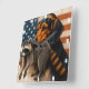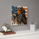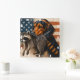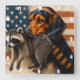 Representación artística de un perro y mapache Beagle en un reloj decorativo, ambientado en un fondo de bandera estadounidense, mezclando patriotismo y compañía animal en un artículo funcional y artístico de decoración casera.