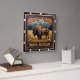 Este ilustracion es un tributo al Oeste Americano, con un bisonte estilizado en un campo de hierba. El fondo cuenta con una cordillera bajo una vibrante puesta de sol. La obra de arte tiene una textura distintiva de cuero labrado y un borde decorativo. Las palabras "BISON, BUFFALO" están en la parte inferior.