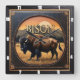 Un ilustracion estilizado de un búfalo en su hábitat natural, situado en un impresionante telón de fondo montañoso. La pieza tiene una textura de cuero labrado y una paleta de colores cálidos y brillantes. La poderosa silueta del animal domina el primer plano, mientras que el texto "BISON" se agrega al diseño.