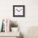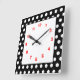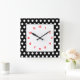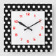 A bold black & white polka dot frame surrounds a white square center with red numbers to mark the hours. However, with a little work on your part you may choose any other color combo you like to go with the black elements in this design. Utilizing the Edit Design button will allow you to change the font style and color of the existing red numbers. You may also change the existing white background to any other color you like. This design looks best on the square clocks.