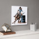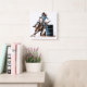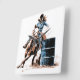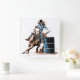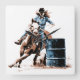 Imagen gráfica de estilo pop artístico en marrón, azul y negro de una carrera de chicas con su caballo alrededor de un barril con el pelo volando. ¡Personalizable.