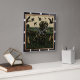Este rústico reloj cuadrado de pared cuenta con un fiel Labrador negro sentado pacientemente en carrizos altos junto a un lago. Los patos vuelan al fondo y un pato solitario nada en el agua, con un pequeño bote cerca, capturando una escena serena de caza de patos.