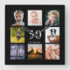 Un reloj de pared como regalo para un cumpleaños número 50 (o cualquier edad) para un hombre, celebrando su vida con un collage de 8 de tus propias fotos. Personalice y agregue la edad de 50 años, y una fecha. Fecha de nacimiento o fecha del aniversario. Letras de color blanco. Fondo negro.