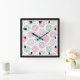 Un reloj con un patrón deliciosamente divertido. Ilustracion de donuts de color rosa pastel y verde con salpicaduras y glaseado.