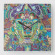 Reloj cuadrado con diseño de Rhonda Stewart. Combinación de colores de Guay compuesta principalmente por tonos azules, verdes, marrones, etc.