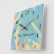 Un fondo azul y amarillo pastel y pequeños corazones rosas decoran este reloj de pared con un nombre personalizado. El reloj de pared puede ser redondo o cuadrado. Qué maravilloso regalo para un compromiso, boda, ducha de novia o nuevo hogar. Todos los derechos reservados © 2015 Alan & Marcia Socolik.