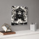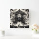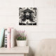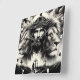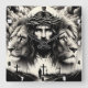 Este llamativo reloj cuadrado en blanco y negro de pared muestra a Jesucristo usando una corona de espinas, flanqueada por dos leones poderosos, simbolizando Su divinidad y fuerza. Una figura solitaria camina hacia tres cruces en una colina desolada, frente a un cielo dramático y nublado, creando una profunda y conmovedora representación religiosa.