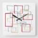 Este divertido reloj moderno de mediados de siglo presenta cuadrados y rectángulos abstractos de color rojo oscuro, azul claro, verde suave y amarillo. Está resaltado por cuadrados y rectángulos abstractos negros delgados. Añade un toque retro divertido a tu decoración de casa.