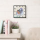 A clock with an adorable illustration of a penguin couple cuddling together. Wearing winter scarves and hats. Set on a cream colored vintage background with turquoise accents along the edges.