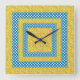 Reloj de pared cuadrado de bonito, con un patrón de mezcla de Daffodils dorados y puntos de Polka Jumbo azul y blanco. Parte de la colección "Daffy-down-Dillies", de Posh & Painterly.