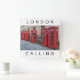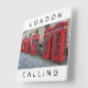 Una hermosa fotografía de algunas de las famosas cajas de teléfonos rojos encontradas por todo Londres en el Reino Unido y las palabras "Londres llamando" impresas en un reloj cuadrado en la pared.