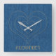 Descubra un reloj cuadrado muy original con una hermosa tela de denim azul, superpuesto con 3 corazones anidados de tamaño decreciente en la misma tela con un lindo punto diagonal. Los corazones tienen un efecto 3D muy cool y la textura de los vaqueros denim es realmente impresionante. Añadimos un nombre de personalizable al final del reloj, escrito en una moderna y elegante tipografía dorada. Por favor, reemplace el nombre predeterminado con el suyo (o con sus iniciales en monograma), o no dude en borrarlo.