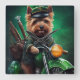 Un amigo peludo detrás de las manillares de una brillante bicicleta verde, usando un traje verde del Día del San Patricio que hace que las cabezas se vuelvan. El perro está vestido con un conjunto festivo, con una corbata verde de arco y un sombrero superior a juego que se sienta cómodos sobre su cabeza. El conjunto presenta un diseño intrincado de rocas de champú y leprechauns, lo que deja claro que este perro está listo para celebrar el Día de San Patricio con estilo.
