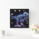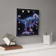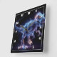 Un luminoso dinosaurio con vibrantes senderos de energía explora un paisaje cósmico lleno de estrellas, creando una fascinante pantalla visual.