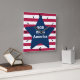 Reloj cuadrado de pared, decoración de arte de pared y decoración de mobiliario de casa accesorio impreso con letras y rayas rojo y rojo América Dios Bendiga el diseño de arte de TheFabricSeal en Zazzle.com #ZazzleMade TheFabricSeal ©️ original. Tiras horizontales de alfileres rojos y blancos con una gran estrella azul y la frase con letras blancas en el interior. Perfecto para mezclar y emparejar la bandera de franjas y estrellas patrióticas americanas, orgullo nacional y cuarto lugar. Celebración de julio del nacimiento de nuestro hermoso país con diseños temáticos y productos juntos. Ideal para complementar la moda informal, decoración interior, celebraciones, entretenimiento, deportes, vacaciones y más. Este reloj de pared único y de alta calidad está imprimido de forma vibrante y personalizado con el proceso AcryliPrint®HD y cuenta con una ranura para colgar el trasero preinstalada para un fácil ahorcamiento y un diseño no rígido.
