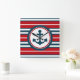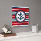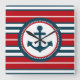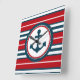 Diseño náutico con la decoración del ancla en forma redonda en el fondo rayado del rojo, azul y blanco