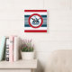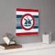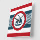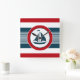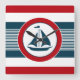 Diseño náutico con decoración de velero en forma redonda sobre fondo rayado azul, rojo y blanco