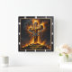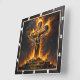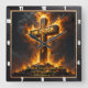 This incredibly powerful and inspiring design captures the theme of Divine Strength through faith. The artwork features a massive Cross inscribed with "THE CROSS," which is dramatically enveloped in brilliant, golden-orange flames and dark smoke, symbolizing trials overcome by Christ's power. A prominent clock motif with dark hands overlays the scene, reminding the observer of the eternal nature of this strength. The design is presented with a high-quality, durable print that creates the striking illusion of a rich, dark wood grain frame surrounding the image, though this border is entirely a visual effect printed directly onto the clock face and is not a separate frame or real wood. The image contains the powerful Bible verse, "I can do all things through Christ who strengthens me. Philippians 4:13." This piece is a powerful reminder of unwavering Christian conviction.
