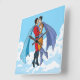 SlipperyJoe's dos superhéroes besando a personalizados voladores coloridos atuendos pechos abrazando y besando regalos artísticos de orgullo gay LGBTQIA promocionando la inclusión diversidad cruzados momento tierno traje rojo capa azul traje de naranja púrpura capa