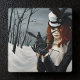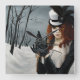 Mujer de Steampunk con el pelo rojo fuera en una caminata de invierno liberando su mensajero de libélula con una llave