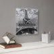 Eiffel Tower from the bottom, looking up. Black and white photo with gray clouds. Roman number clock face. If making changes, be sure the number image is on top. Change the square clock for round clock styles.