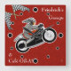 Excelente regalo para los aficionados a la motocicleta en su vida, este reloj de pared presenta la pintura digital original de Leslie Sigal Javorek de un Art Deco Café Racer+banderas a cuadros en un fondo rojo falso texturado. El texto en blanco dice "¡Garaje de Friedrich y café Oil-A!". Cambiar el nombre, cambiarlo todo o borrar.