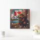 Un castor descansa sobre un árbol junto a un lago sereno, con una bandera canadiense en el fondo y montañas que suben a la distancia.