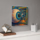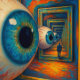 "El corredor de ver" - Un retrato surrealista. Un gran pasillo con espejos se extiende hasta la eternidad, cada segmento con un enorme ojo vigilante. En su centro, un hombre se mantiene inmóvil sin ver su propia reflexión, perdido en la mirada infinita. El estilizado cuadro equilibra calidez y frescura, distancia e intimidad, en una meditación sobre percepción, tiempo y la silenciosa confrontación entre sí y infinito.