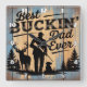 Este gráfico rústico declara orgullosamente "El mejor papá de BUCKIN" en una tipografía audaz y angustiada. Las siluetas de un cazador con un rifle, un venado majestuoso y un perro fiel se paran entre pinos, simbolizando una aventura al aire libre. Todo el conjunto se sitúa sobre un fondo de madera de textura y meteorología, creando un homenaje perfecto para un padre entusiasta de la caza.