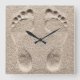 Un reloj de decoración divertida de la pared temática de la playa con un par de huellas en la arena en un diseño gráfico que se parece a la arena de la distancia y añade carácter y estilo a cualquier habitación de tu casa. Diseñado como un reloj de novedad o reloj que se añade a una casa de playa.