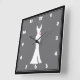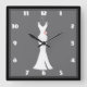 A square clock with a classy gray background. Designed with an elegant white gown hanging down from a hanger. Simple minimalist design.