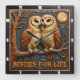 This appealing square wall clock features a highly dimensional, nocturnal illustration of two owls perched closely together on a wooden branch. The entire design is rendered in deep brown, orange, and dark blue tones, strongly suggesting a carved relief or Engraved Wood Look. The owls have highly detailed, textured feathers in shades of gold and brown, and are set against a dark blue night sky. The background includes a large, textured golden moon and stylized stars. The large, three-dimensional embossed text "BESTIES FOR LIFE" is carved across the lower center. The clock face features a simple clock face border with large, white, numbered tick marks (1 to 12) integrated into the frame. The artwork is surrounded by a dark, textured decorative border that resembles a black wood frame.
