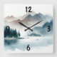 Lleve la serena belleza de un bosque de invierno Misty a su espacio con este silencioso reloj de pared de vidrio. Con un paisaje de inspiración vintage con montañas y un tranquilo lago, es un arte de acuarela.