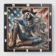 Representación intrincada de un esqueleto vestido con una indumentaria occidental vibrante, con una camisa de manta, botas y un gorra, sentados contentosamente contra un telón de fondo de la bandera norteamericana, que simboliza los temas de libertad e individualidad.
