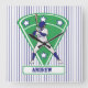 El diseño personalizado de estrellas de béisbol en blanco y azul muestra a un bateador tomando un columpio con un uniforme de béisbol azul y blanco con un diamante verde de campo de béisbol con estrellas azules y blancas en el fondo. Esto puede ser totalmente personalizado con el nombre de su elección. Disponible en otros colores de nuestra tienda y damos la bienvenida a las solicitudes de personalizados para diferentes combinaciones de colores para los colores de su equipo. Contáctenos a través de nuestra tienda con su solicitud antes de la compra y estaremos encantados de crearla para usted.